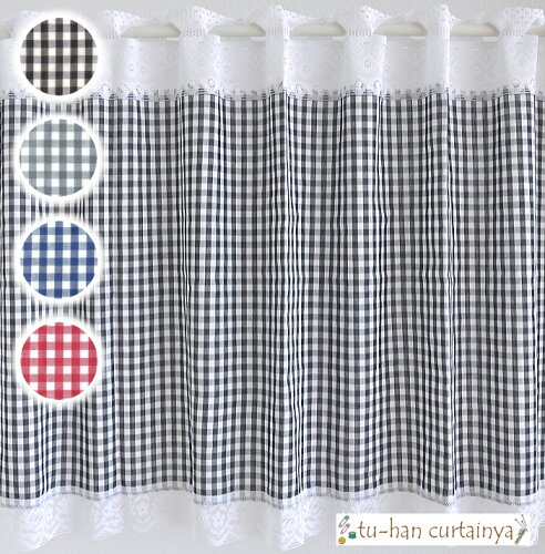 【あす楽】日本製【カフェカーテン】ギンガムチェック レースカーテン 小窓用 1枚入り おしゃれ可愛い つっぱり式 レース付き 綿100% カラフル4色 カフェレース