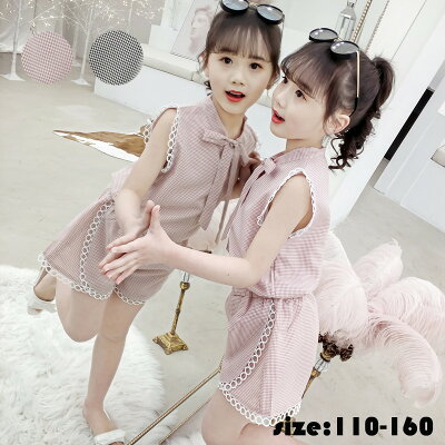 韓国子供服 2点セット トップス+半ズボン カジュアル ナチュラル チェック柄 パンツ 夏 リボン ノースリーブ 薄手 セットアップ ゆったり リゾート 女の子 キッズ こども ベビー 可愛い きれいめ //卒園式/入学式/パーティ 110-160cm ピンク ブラック