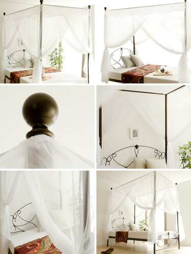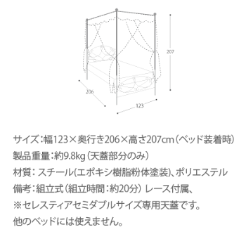 サイズ:幅123×奥行き206×高さ207cm(ベッド装着時) 製品重量:約9.8kg(天蓋部分のみ) 材質: スチール(エポキシ樹脂粉体塗装)、ポリエステル 備考:組立式(組立時間:約20分) レース付属、 ※セレスティアセミダブルサイズ専用天蓋です。